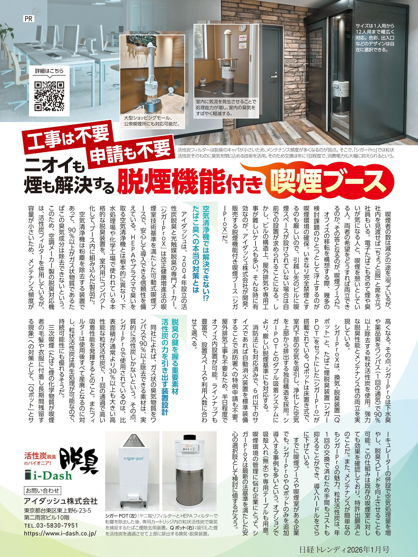日経トレンディ 2026年1月号に弊社の脱煙機能付き喫煙ブース「シガーProX」に関する記事を掲載しました。