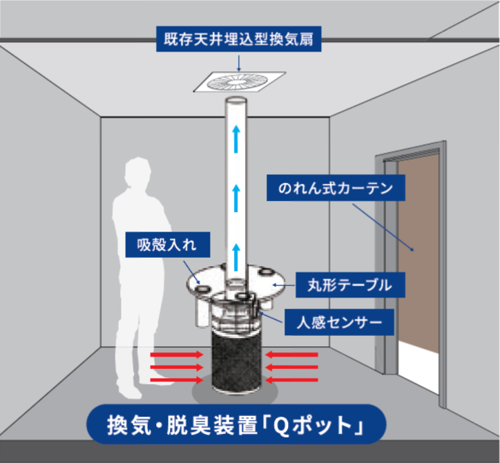 一方、脱臭装置は、工場や下水処理場などの悪臭ガスを除去するために産業品として登場してきたもので、有害なVOCを瞬時に吸着・捕捉する能力をもつ装置として多くの実績を有しています。Qポットはこうした技術を活用し、活性炭装置にHEPAフィルター等を組み込むことによって、タバコの臭いが驚くほど除去できるのです。