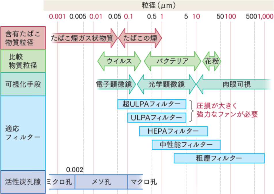 図2:物質の粒径とフィルター・活性炭の除去範囲